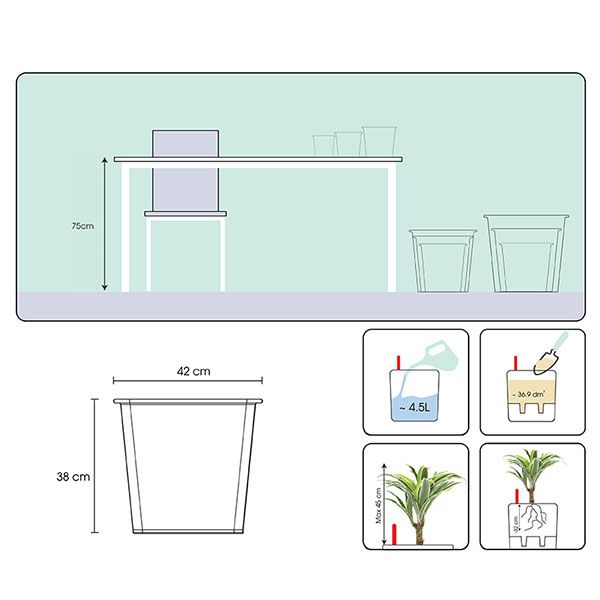 | Size chậu (cm) | Trọng lượng chậu | Thể tích đất | Thể tích nước |